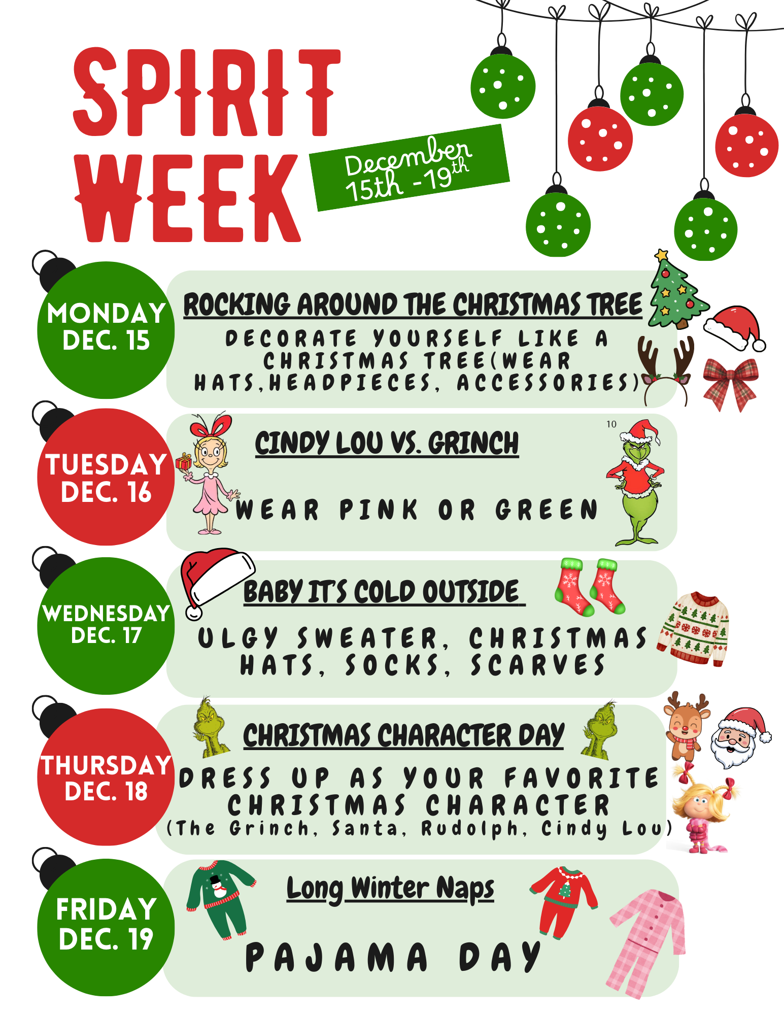 [Sunday, Dec 14 at 7:03 PM]Reminder it's Spirit week this week/Semana del espรญritu navideรฑo en la escuela esta semana